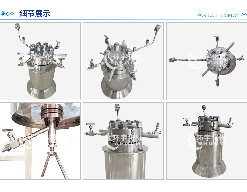 常規(guī)釜蓋開口 氣相口配針形閥,液相口配針形閥及釜內(nèi)插底管,固體加料口配絲堵,測(cè)控溫口配鉑電阻,壓力表安全爆破口配壓力表及安全防爆裝置,釜內(nèi)冷卻盤管進(jìn)、出口配水咀