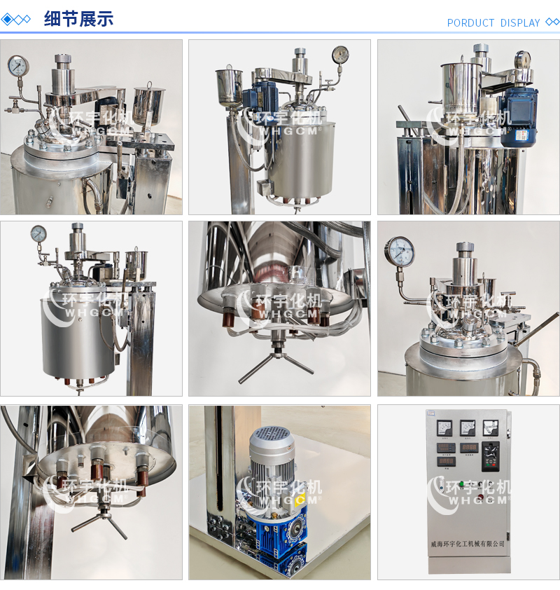 常規釜蓋開口 氣相口配針形閥,液相口配針形閥及釜內插底管,固體加料口配絲堵,測控溫口配鉑電阻,壓力表安全爆破口配壓力表及安全防爆裝置,釜內冷卻盤管進、出口配水咀