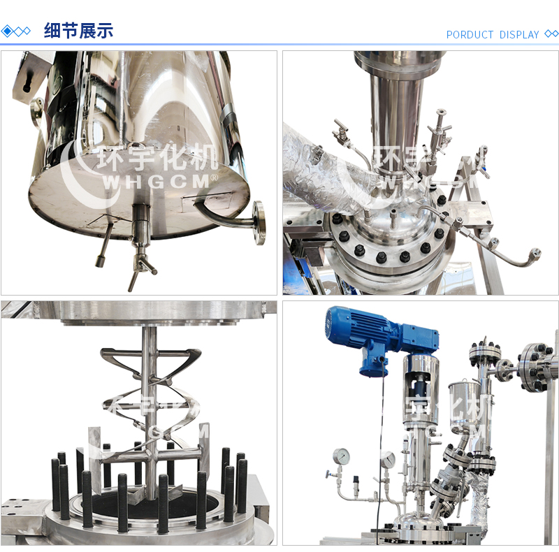 常規釜蓋開口 氣相口配針形閥,液相口配針形閥及釜內插底管,固體加料口配絲堵,測控溫口配鉑電阻,壓力表安全爆破口配壓力表及安全防爆裝置,釜內冷卻盤管進、出口配水咀