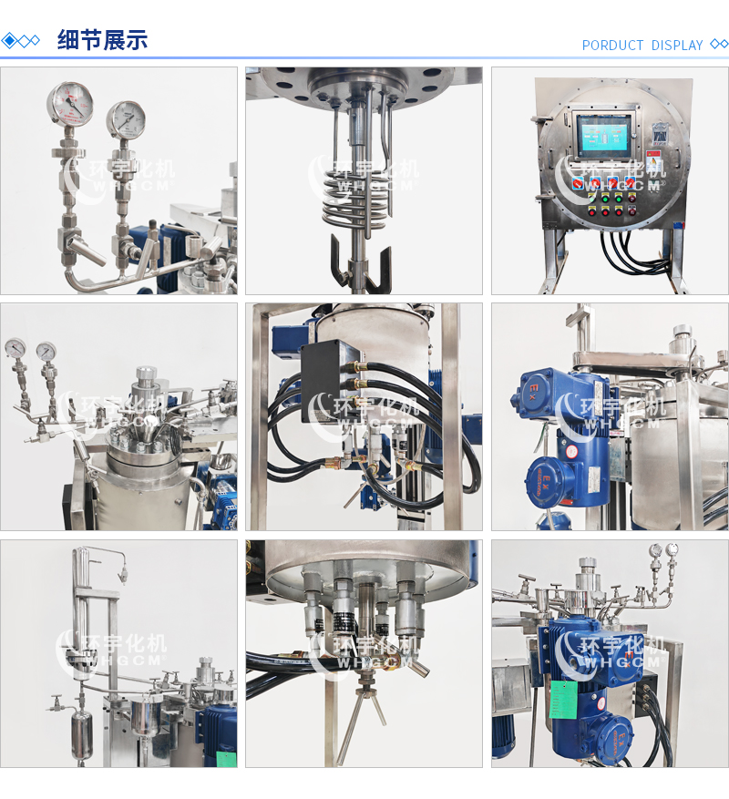 常規釜蓋開口 氣相口配針形閥,液相口配針形閥及釜內插底管,固體加料口配絲堵,測控溫口配鉑電阻,壓力表安全爆破口配壓力表及安全防爆裝置,釜內冷卻盤管進、出口配水咀