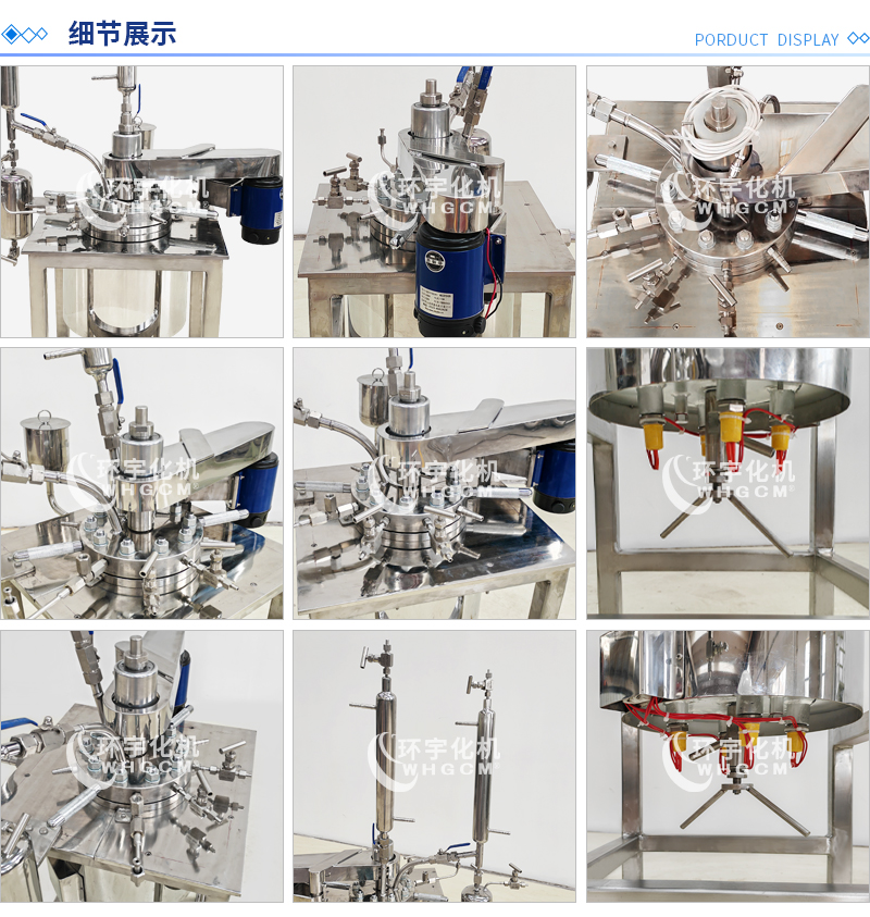 常規釜蓋開口 氣相口配針形閥,液相口配針形閥及釜內插底管,固體加料口配絲堵,測控溫口配鉑電阻,壓力表安全爆破口配壓力表及安全防爆裝置,釜內冷卻盤管進、出口配水咀