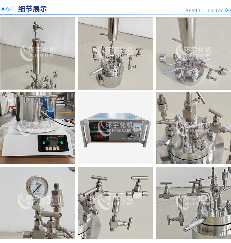 常規釜蓋開口 氣相口配針形閥,液相口配針形閥及釜內插底管,固體加料口配絲堵,測控溫口配鉑電阻,壓力表安全爆破口配壓力表及安全防爆裝置,釜內冷卻盤管進、出口配水咀