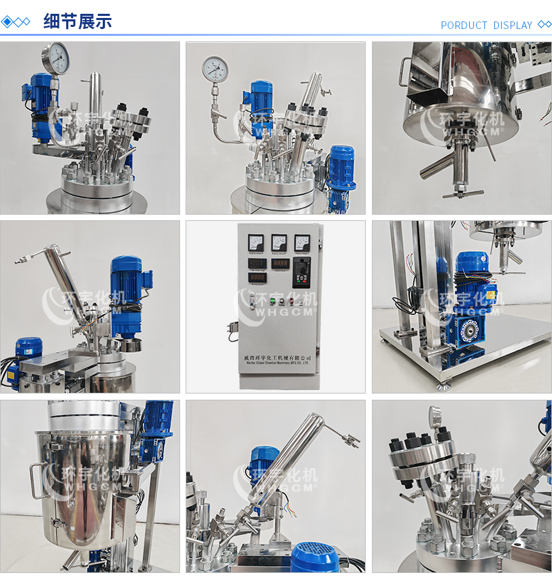 常規釜蓋開口 氣相口配針形閥,液相口配針形閥及釜內插底管,固體加料口配絲堵,測控溫口配鉑電阻,壓力表安全爆破口配壓力表及安全防爆裝置,釜內冷卻盤管進、出口配水咀