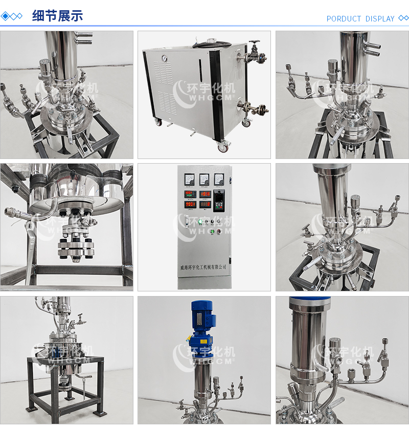 常規釜蓋開口 氣相口配針形閥,液相口配針形閥及釜內插底管,固體加料口配絲堵,測控溫口配鉑電阻,壓力表安全爆破口配壓力表及安全防爆裝置,釜內冷卻盤管進、出口配水咀