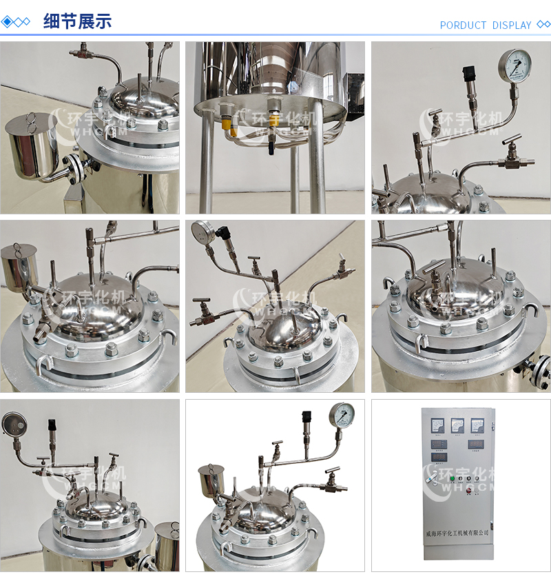 常規釜蓋開口 氣相口配針形閥,液相口配針形閥及釜內插底管,固體加料口配絲堵,測控溫口配鉑電阻,壓力表安全爆破口配壓力表及安全防爆裝置,釜內冷卻盤管進、出口配水咀
