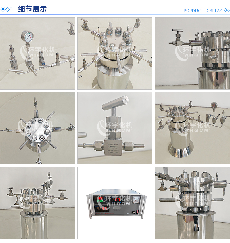 常規釜蓋開口 氣相口配針形閥,液相口配針形閥及釜內插底管,固體加料口配絲堵,測控溫口配鉑電阻,壓力表安全爆破口配壓力表及安全防爆裝置,釜內冷卻盤管進、出口配水咀