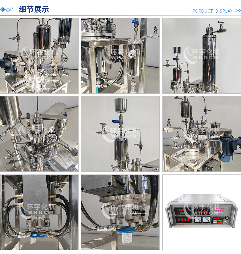 常規釜蓋開口 氣相口配針形閥,液相口配針形閥及釜內插底管,固體加料口配絲堵,測控溫口配鉑電阻,壓力表安全爆破口配壓力表及安全防爆裝置,釜內冷卻盤管進、出口配水咀