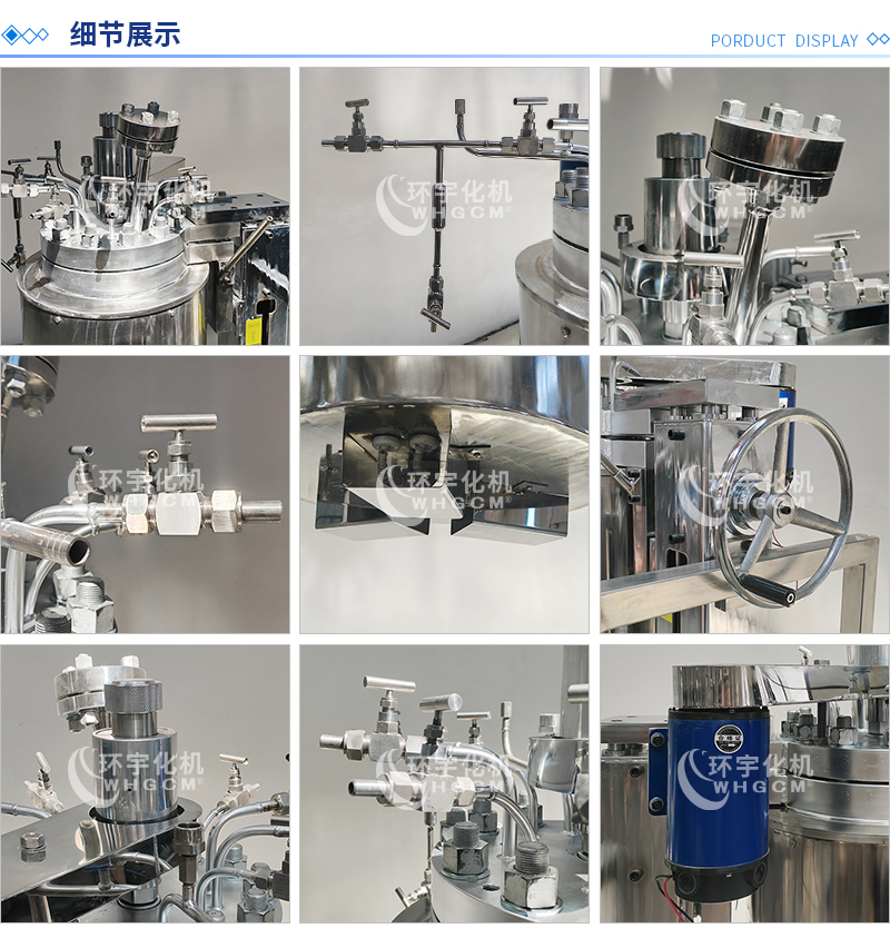 常規釜蓋開口 氣相口配針形閥,液相口配針形閥及釜內插底管,固體加料口配絲堵,測控溫口配鉑電阻,壓力表安全爆破口配壓力表及安全防爆裝置,釜內冷卻盤管進、出口配水咀