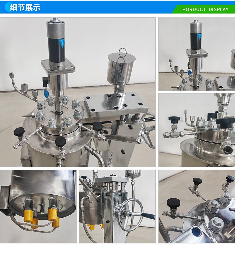 常規釜蓋開口 氣相口配針形閥,液相口配針形閥及釜內插底管,固體加料口配絲堵,測控溫口配鉑電阻,壓力表安全爆破口配壓力表及安全防爆裝置,釜內冷卻盤管進、出口配水咀